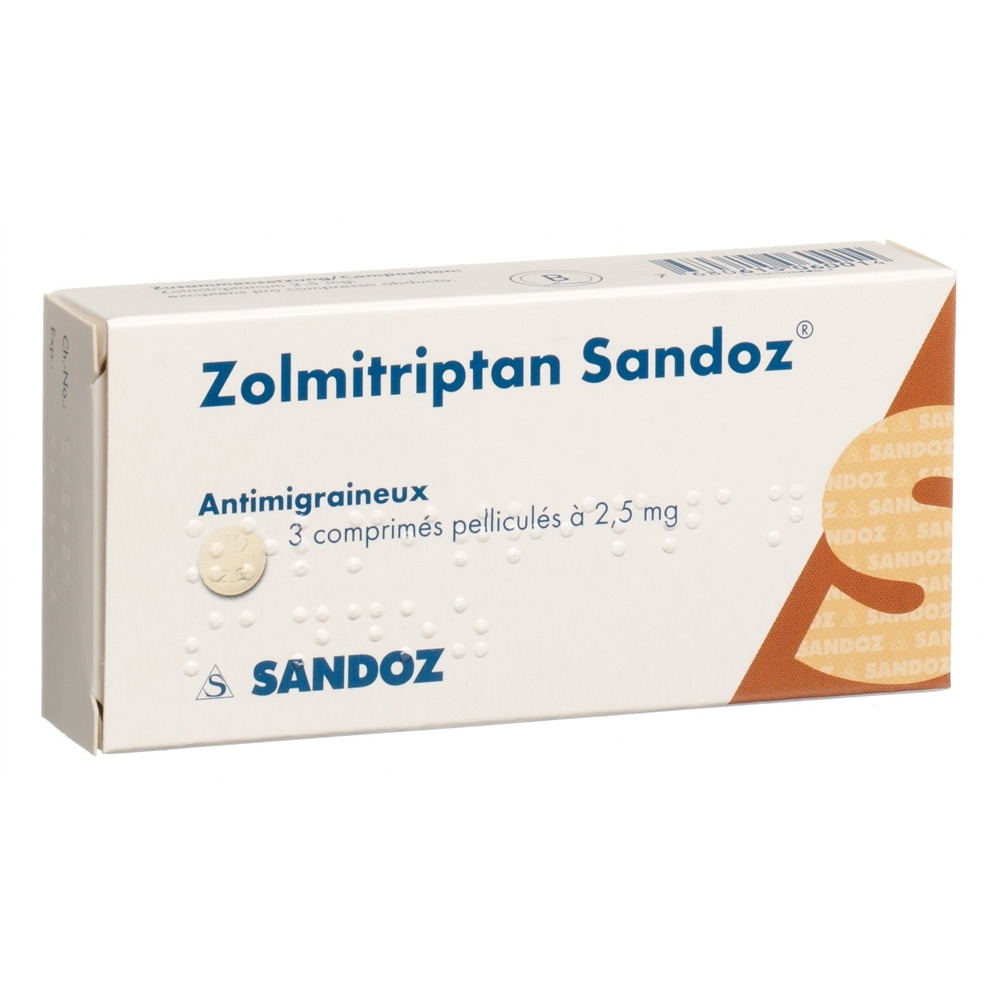 Zolmitriptan Sandoz comprimés pelliculés à 2,5 mg: emballages de 3, 6 et 12 comprimés pelliculés.
